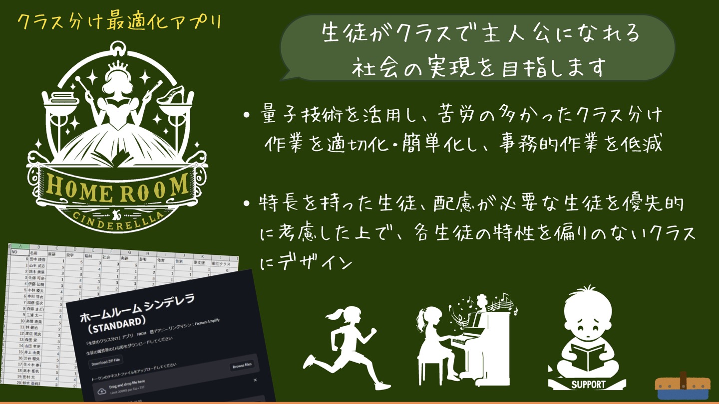 クラス分けの未来を切り拓く「HomeRoom Cinderella」。量子技術を活用し、生徒一人ひとりが主人公になる理想的なクラスを創り出します。この教師向けアプリは、生徒同士の相性や個々の特性を織り交ぜ、迅速で的確なクラス分けを実現。手間暇のかかるクラス分けから解放され、未来の学びの環境が築けます。