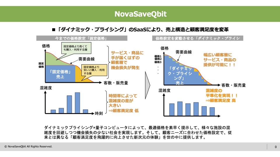 ダイナミックプライシング×量子コンピュータによって、最適価格を素早く提示して、様々な施設の混雑度を回避しつつ機会損失の少ない社会を実現します。そして、顧客ニーズに合わせた価格設定で、従来とは異なる「顧客満足度を飛躍的に向上させた新次元の体験」を世の中に提供します。