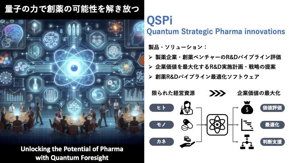 不確実性の高い創薬R&Dにおける意思決定は難しく、必ずしも明瞭でありません。我々はパイプライン情報から企業単位での将来価値を最大化するR&D計画を提案できる量子アニーラを用いた全体最適化技術を提供します。これにより医薬品業界全体の投資の活性化、経済効率の改善により、医療費の適正化を目指します。